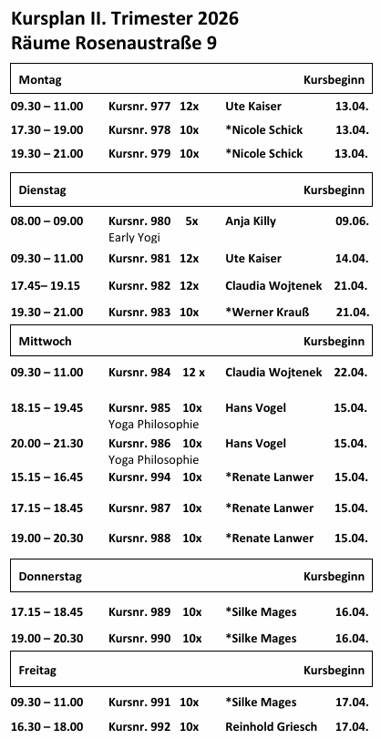 Kursplan Unsere Kurse finden in unseren Räumlichkeiten im Rosenauviertel:Rosenaustraße 9, 90429 Nürnberg statt.